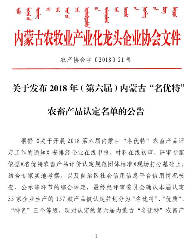 標(biāo)題:關(guān)于發(fā)布2018年(第六屆)內(nèi)蒙古“名優(yōu)特”農(nóng)畜產(chǎn)品認(rèn)定名單的公告
