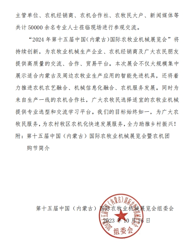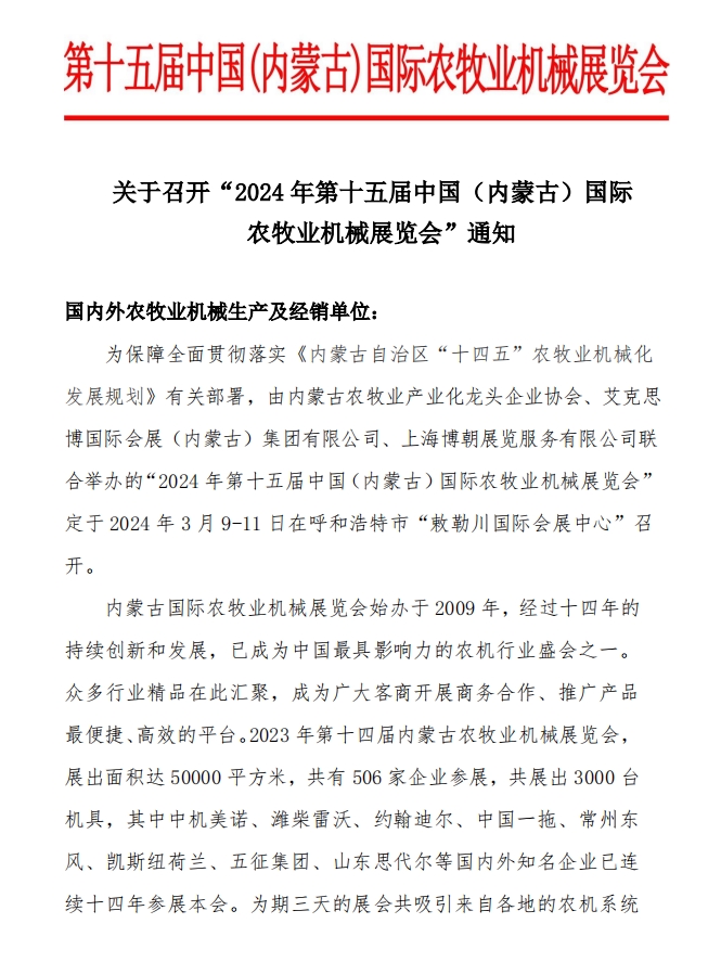 關(guān)于召開“2024年第十五屆中國(guó)(內(nèi)蒙古)國(guó)際農(nóng)牧業(yè)機(jī)械展覽會(huì)”通知