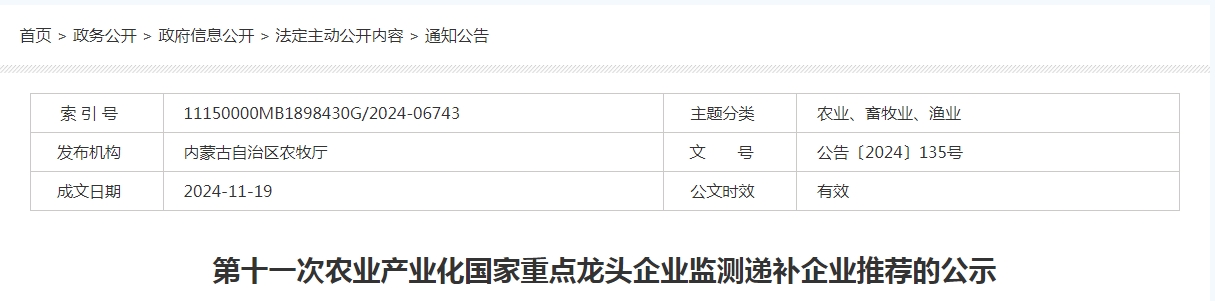 現將擬遞補企業(yè)予以公示,公示時間:2024年11月19日—2024年11月21日,公示期3天。公示期間如有問題,請?zhí)峁┫嚓P證據向農牧廳機關紀委反映。廳機關紀委電話:0471—6651073。廳鄉(xiāng)村產業(yè)發(fā)展和農墾處電話:0471—6652301。