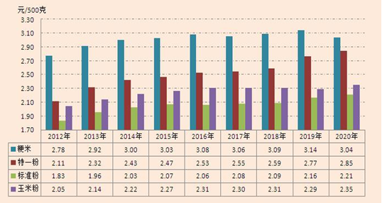6   內(nèi)蒙古自治區(qū)20122020年主要成品糧零售價格對比圖